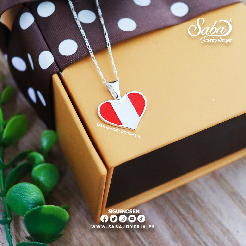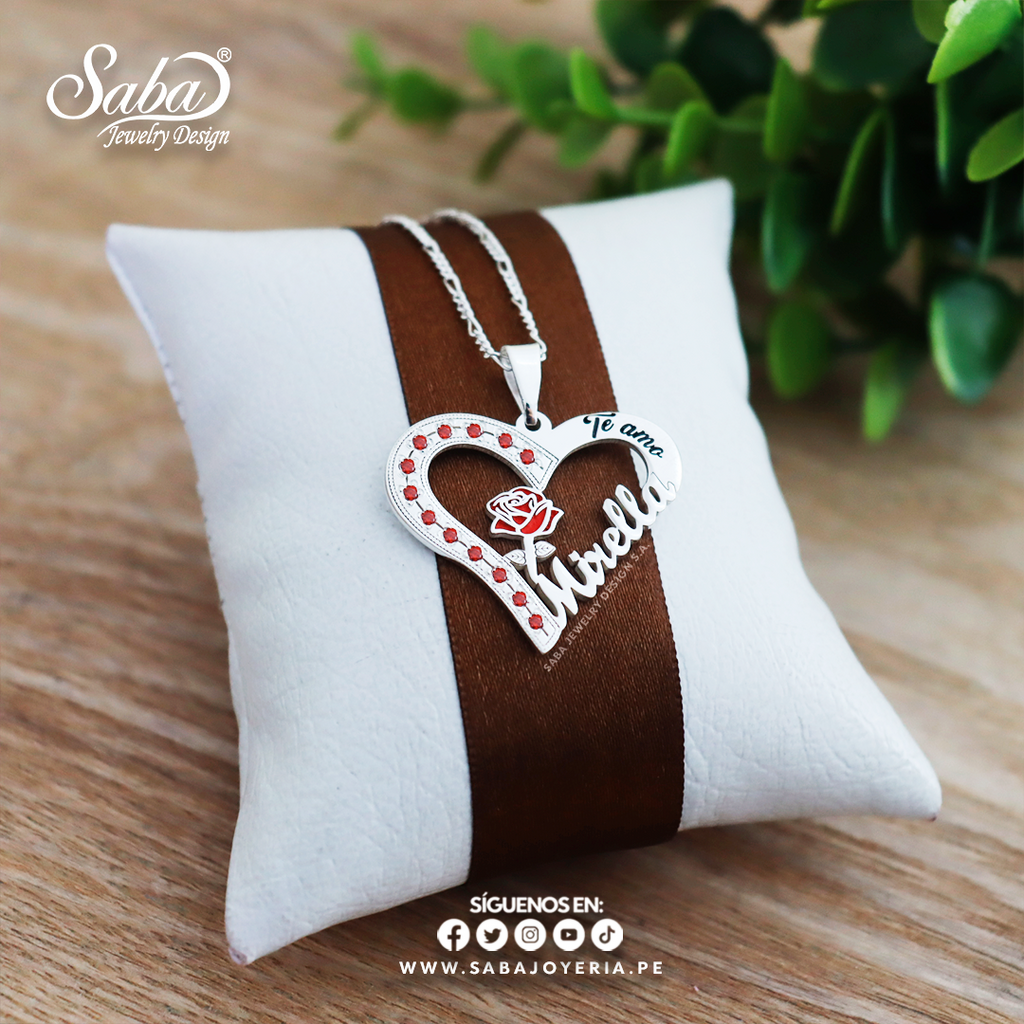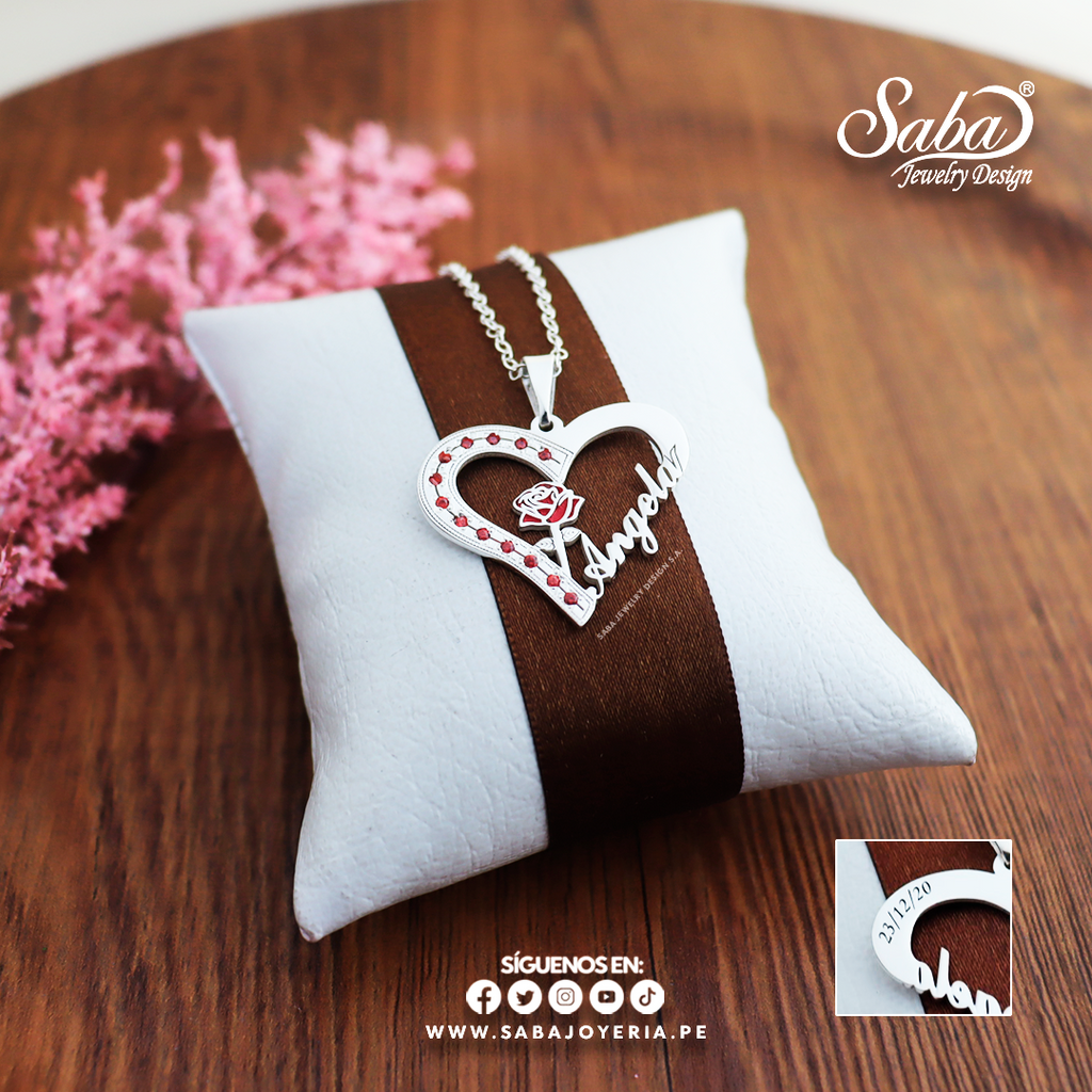 Collar Corazón Rosa con Circones Rojos - Plata Fina
